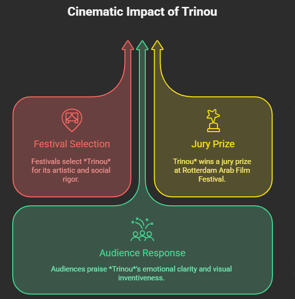 Following its completion, Trinou entered the international film festival circuit, where it was screened across Europe, North America, the Middle East, and Africa. Its selection by festivals known for curating socially and artistically rigorous short films positioned it within a global conversation about contemporary short-form cinema.