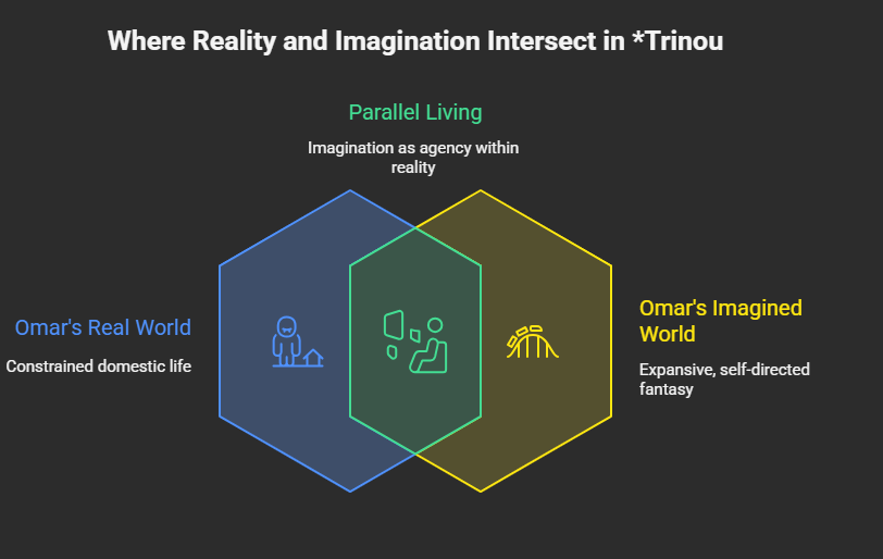 At its thematic core, Trinou is a film about agency. Omar’s imagination is not a passive retreat but an active process of meaning-making. Through fantasy, he reorganizes the world on his own terms, selecting images, movements, and narratives that counterbalance his physical constraints.